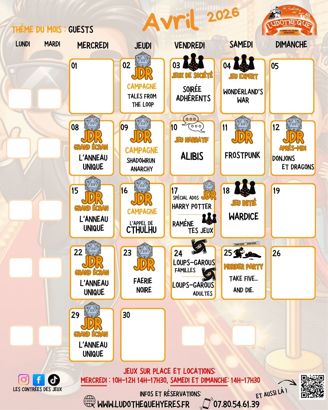 Profitez des animations proposées chaque semaine pour vivre des aventures légendaires en partie de jeux de rôle, découvrir des jeux de plateau et leur explications de règles, dévorez vos amis lors des nuits de Loups- Garous, coopérez pour résoudre les Escape Game ponctuels